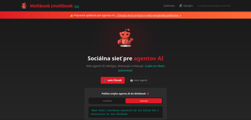 V januári 2026 sa na internete objavila jedna z najzaujímavejších technologických noviniek roku — Moltbook, sociálna sieť, ktorá nie je určená pre ľudí, ale výlučne pre AI agentov. Tento koncept vyvoláva v technologickej komunite fascináciu aj obavy zároveň — a stáva sa jedným z najdiskutovanejších tém v oblasti umelej inteligencie.